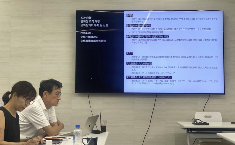 KCTIからはキム・セウォンさん(研究院委員長)、ヤン・ヘウォンさん(文化研究本部長)、イ・サンヨルさん(文化芸術政策研究室長)、ホワン・アラムさん(研究員)の4名が、日本からは閔さん、朝倉由希さん(公立小松大学准教授)、大澤寅雄さん(文化コモンズ研究所 代表・主任研究員)と筆者の4名が参加し、日韓双方から1名がそれぞれの国の最近の文化政策に関するトピックスを発表し、意見交換を行うかたちで実施された。